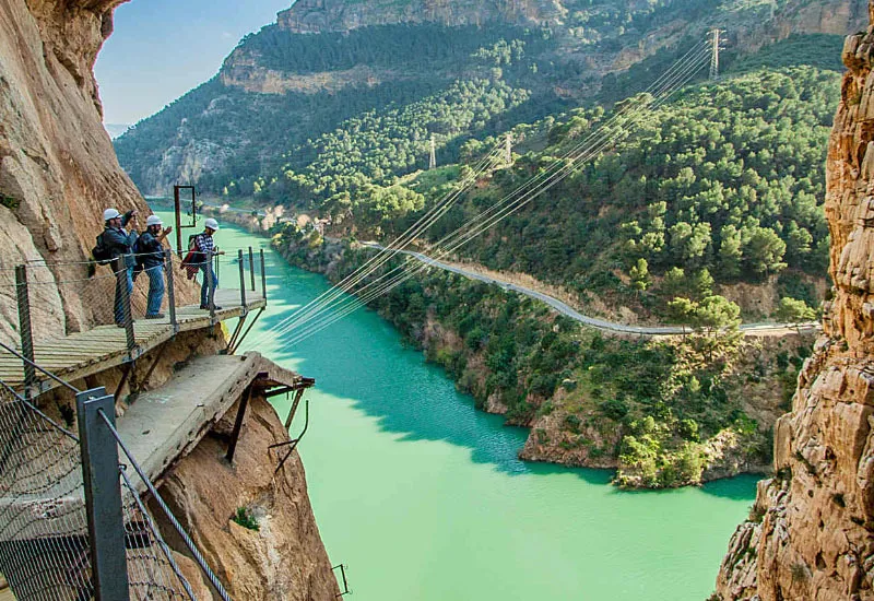 Caminito del Rey: Rozpoczniemy naszą wycieczkę od pieszej wędrówki po jednym z najbardziej widowiskowych szlaków w Hiszpanii – Caminito del Rey. Zawieszona na skalnych ścianach ścieżka o długości 7,7 km biegnie wzdłuż wąwozu El Chorro, oferując spektakularne widoki na dolinę i rzekę Guadalhorce. Trasa jest bezpieczna, ale dostarcza dreszczyku emocji i niezapomnianych wrażeń. To miejsce kiedyś służyło jako szlak transportowy dla robotników z lokalnych elektrowni wodnych.